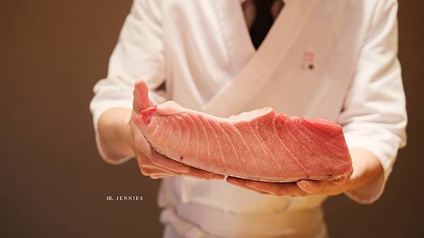 第一次這麼近距離看到傳說中的鮪魚!!魚肉呈現粉紅,前方為蛇腹,需要先去除筋膜,這一條又一條,一格又一格的中間油筋需要用時間去熟成軟化至少四天,才能在口中嚐到油質豐厚的香氣。