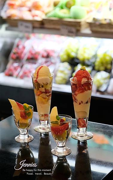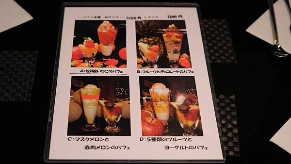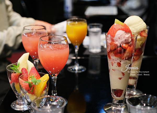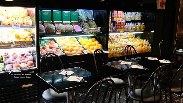空間以黑色為主色調更襯托出水果各種繽紛的顏色,感覺也太夢幻了呀!!雖然我不會像甘太郎一樣翻白眼翻的那麼誇張,但是我能理解他看到甜點時眼睛閃爍的光芒。桌上另外還點了葡萄柚及柳橙汁 500日圓,都是現打現壓的,不加冰不加糖,喝的就是果汁原本最單純的味道,超健康的(晚上如果不想吃冰淇淋改喝果汁也是滿不錯的)至少比手搖飲健康多了!!