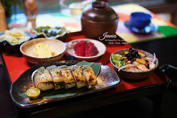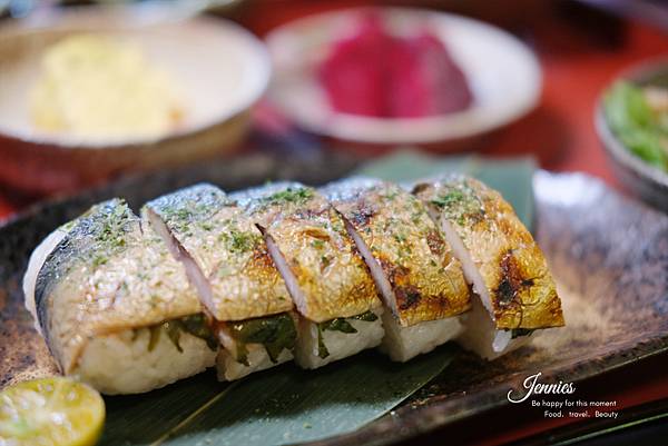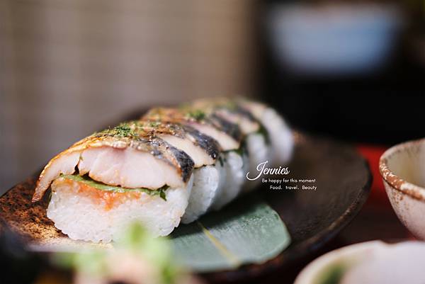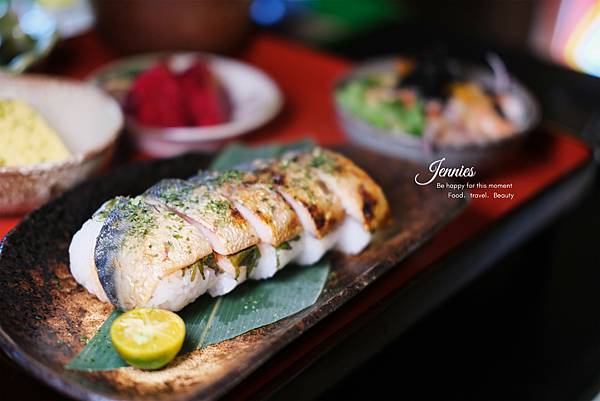 JeeWoo吉屋鯖魚棒壽司相當講究其作法,將鯖魚以來自日本福井縣若狹市特有的「濱燒技術」烤製,搭配了薑片與紫蘇葉,醋飯則特別挑選了永齡農場的147號香芋米來製作。