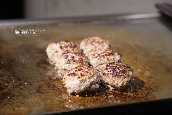 廚師已經將事先捏好的漢堡排整齊的排列在鐵板上慢慢煎烤,不斷翻面,前置作業準備加上煎好送上桌的時間大概抓個20-30分鐘。這是在考驗我的胃嗎?哈哈哈~預約的時間是一點鐘,肚子還真不是普通的餓。