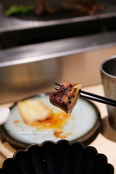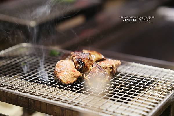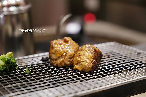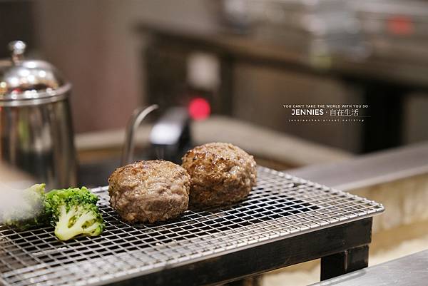 廚師會將漢堡排煎烤至五分熟左右,送到客人面前的這個炭槽上透過炭火繼續加熱,熟度可以隨個人喜好增加或遞減。上次吃的另外一間是給三顆漢堡排肉,這邊是二顆,另外還有花椰菜搭配。烤的香嫩的漢堡排肉可以先暫時放在鐵網上讓它繼續再烤一下。餐廳另外也有立蛋的獎勵贈送。