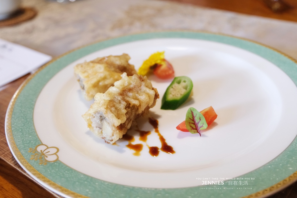 以鮑魚、金鉤蝦、韭菜及秋葵慢火酥炸將山珍海味以藝術的視覺呈現,炸的酥香的外皮一口咬下裡面的餡料紮實,味道平衡,充滿風味。