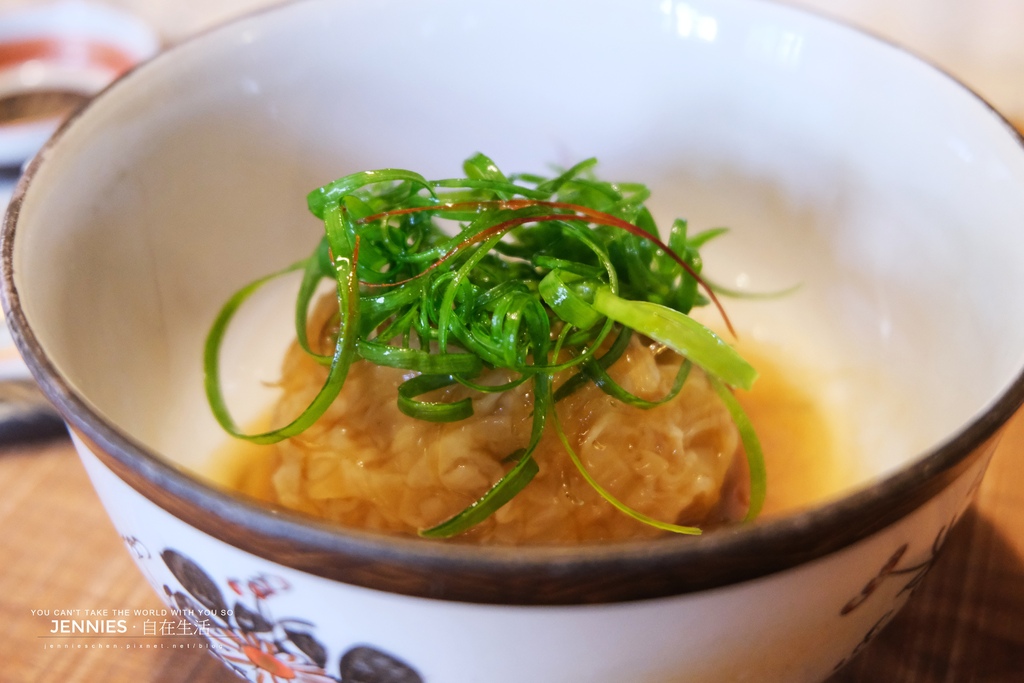 則是以華麗之姿出現,打開高雅的器皿香氣直逼而來;以手打花枝漿、無毒白蝦以及魚翅作成一個丸狀的形狀,並以柴魚高湯慢火燉煮使其香氣融入食材,切開的時候輕煙裊裊,入口的湯汁甘甜味美,整口餘香撩撥舌間,細緻的口感充滿自然鮮美,也太好吃!!