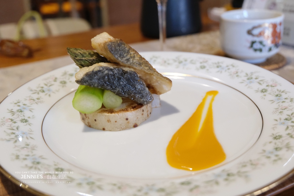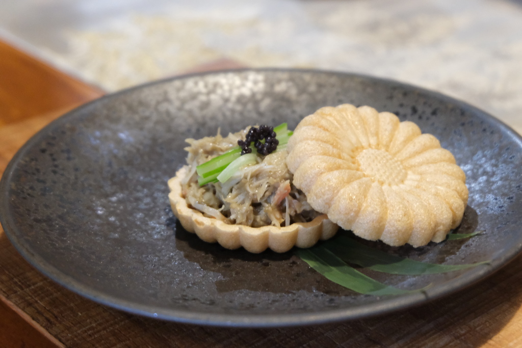 第一道上桌的前菜以優雅的菊花造型最中填入松葉蟹膏與蟹肉,再搭配魚子醬點綴,猶記得當天屋內空間傳來輕柔的旋律,我們幾個好朋友坐在舒適的空間品嚐這些料理愉悅聊著天溫柔且美好。