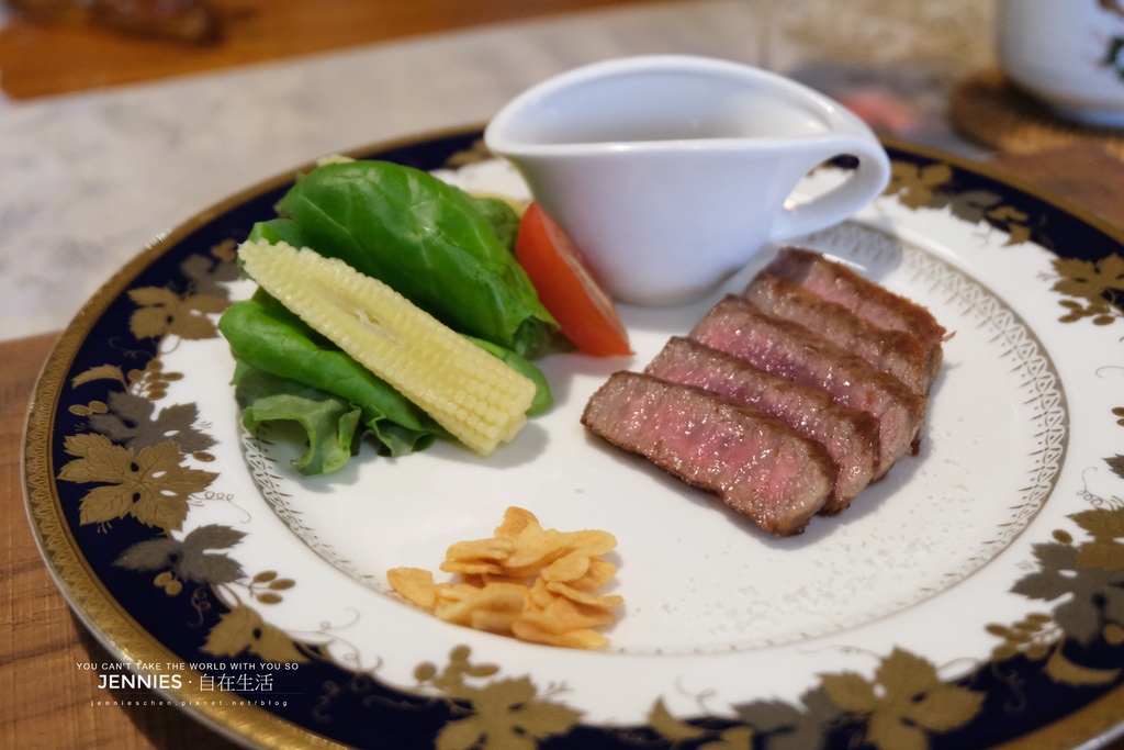 使用A5沙朗部位搭配松露岩鹽!我們不約而同全部都選了和牛這道主食,但其實店長也很推薦松阪豬。個人較喜歡牛肉多於豬肉,不過不同的料理方式或許也能呈現食物最佳的美味,A5沙朗牛排上桌時已經先被分成五小塊,沾上岩鹽及蒜片都好好吃喔~肥瘦均勻,油花的香氣好逼人!!