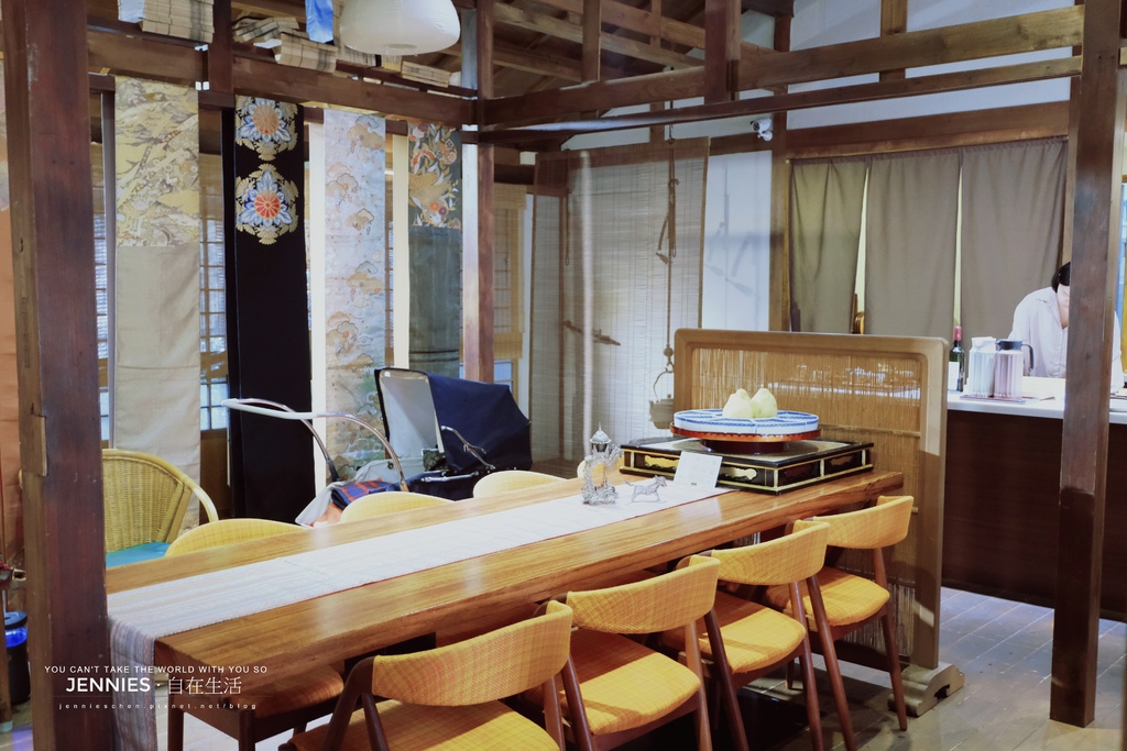 我們被帶領至用餐空間,踏入這個場域,大量的木作營造溫馨和諧的氛圍,垂吊的竹簾將空間區隔開來,桌上擺有綠意盆景,並將光源減至最低使心緒更加放鬆也讓呼吸的速度變得緩慢了起來。