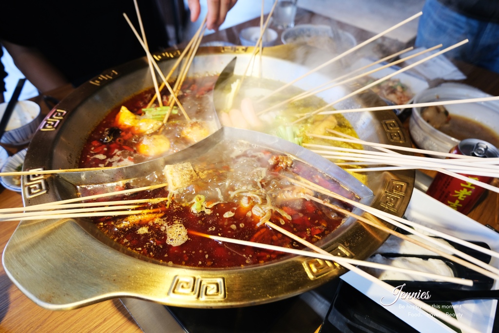 串串的份量都不太多,所以其他可以搭配的麵食及江湖菜也很多,看著各種竹籤下鍋的樣子,有種奇妙的感覺。有的食物煮著煮的就忘了自己原來是放在哪一鍋?