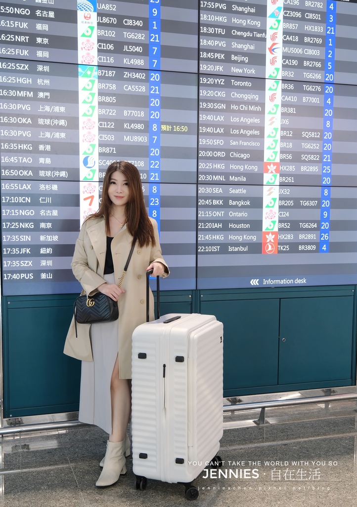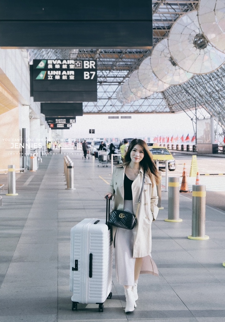 不信!你看看!這樣的穿搭配上白色的波卡箱,整個無敵美翻天!!我的身高不高,155cm,一開始拿到這個波卡箱不穿靴子,比例上就顯得行李箱過大,穿上靴子後的高度搭配很剛好耶!!而且拉著它在機場走動的時候非常優雅,它的聲音比一般的行李箱更安靜,推起來也很滑順不卡,360度旋轉。近期剛好有三個新的行李箱做比較,With Me這款行李箱的輪子是最安靜的,通常輪子會有分單向輪及萬向輪,單向輪拖起來較省力但不適合長時間拖行,而一般行李箱現在用的都是萬向輪可以四個輪子同時平行推移也可以依照行走的方式以後二輪著地拖行方式(建議若要延長使用的時間最好是四輪平行推移)