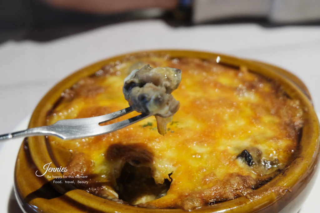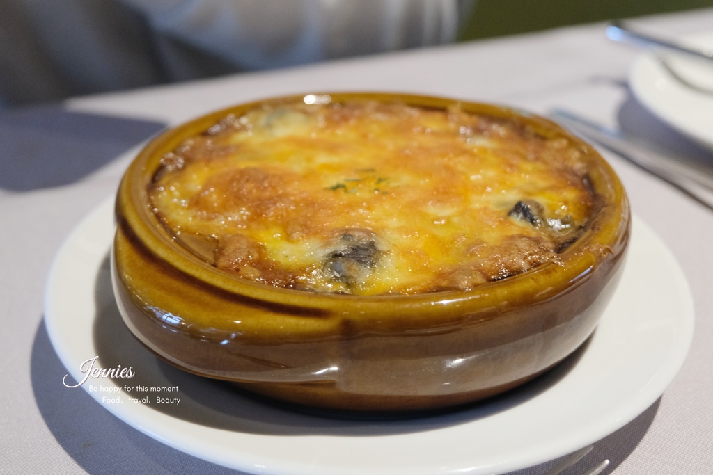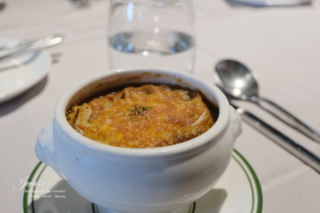 湯品有招牌酥皮蘑菇濃湯、焗烤起司洋蔥湯、漁夫海鮮清湯 (加購酥皮一份60元);焗烤起司洋蔥湯真的很讚,熬的很入味,舀起來滿滿的洋蔥加上起司真是好喝~作法偏老派,老派永遠最經典。
