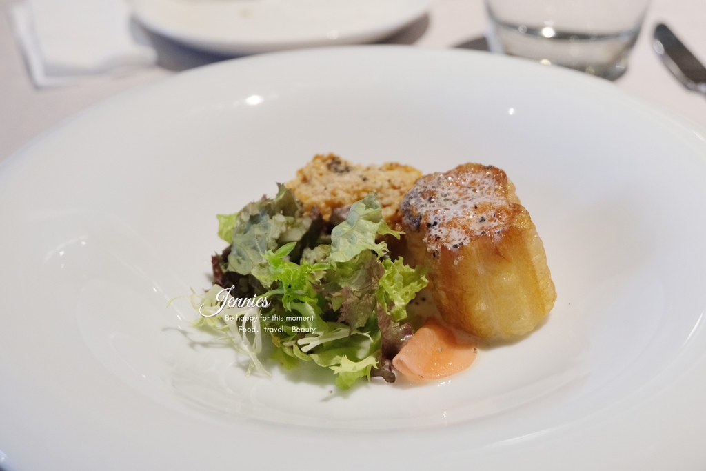 裡面以蒜、起司及牛骨汁做搭配,吃起來彈性十足肉質鮮美。除了以上的前菜還有山火腿捲干貝、義式辣味炒手、酪梨品味沙拉、香煎海蝦、鴨胸握壽司。