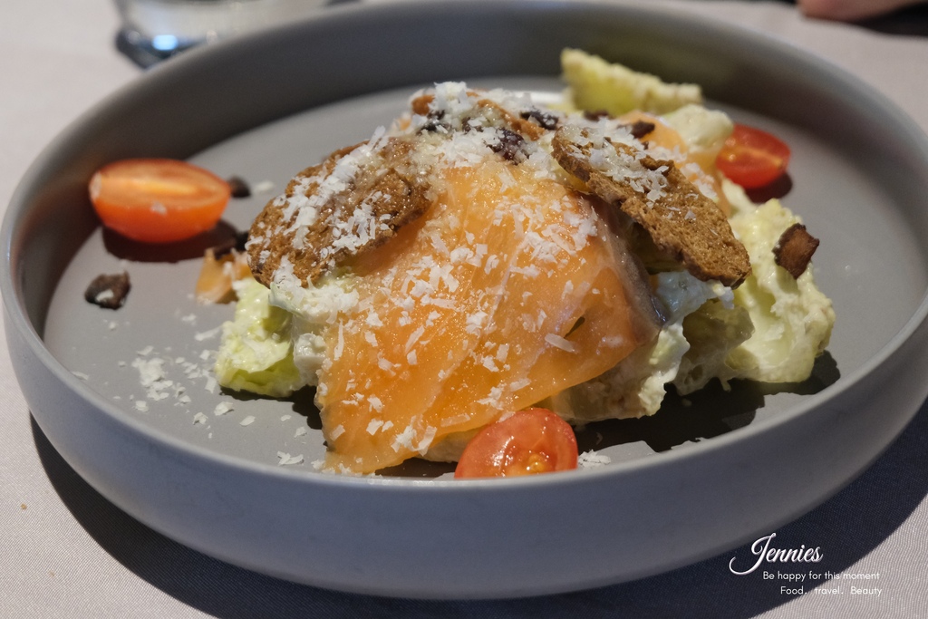 前菜燻鮭魚凱薩沙拉裡面有培根、帕達諾起司、聖女蕃茄,鮭魚吃起來肉嫩,刨上的起司搭配生菜沙拉讓人一口接一口!雅室的湯品及前菜都還保持台灣早期高級牛排餐廳的作法。