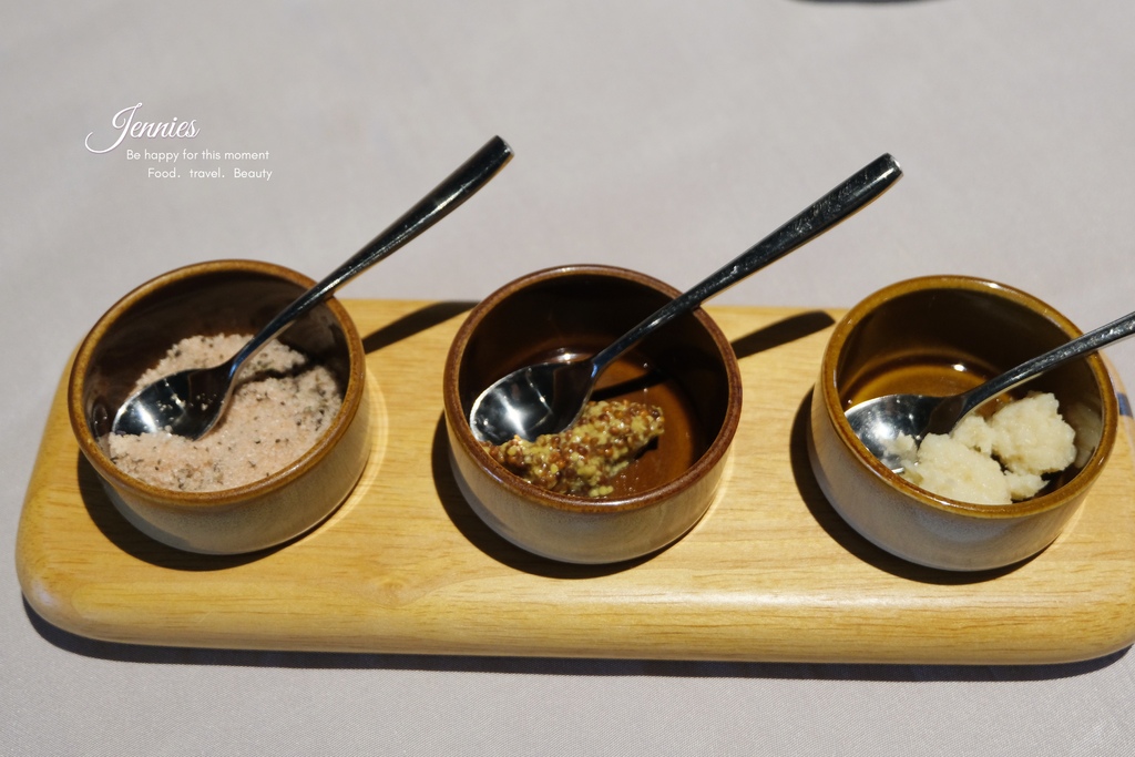 牛排另外搭配了玫瑰鹽、芥末籽及辣根醬、桌上另有黑胡椒及海鹽,可根據個人口味選擇。