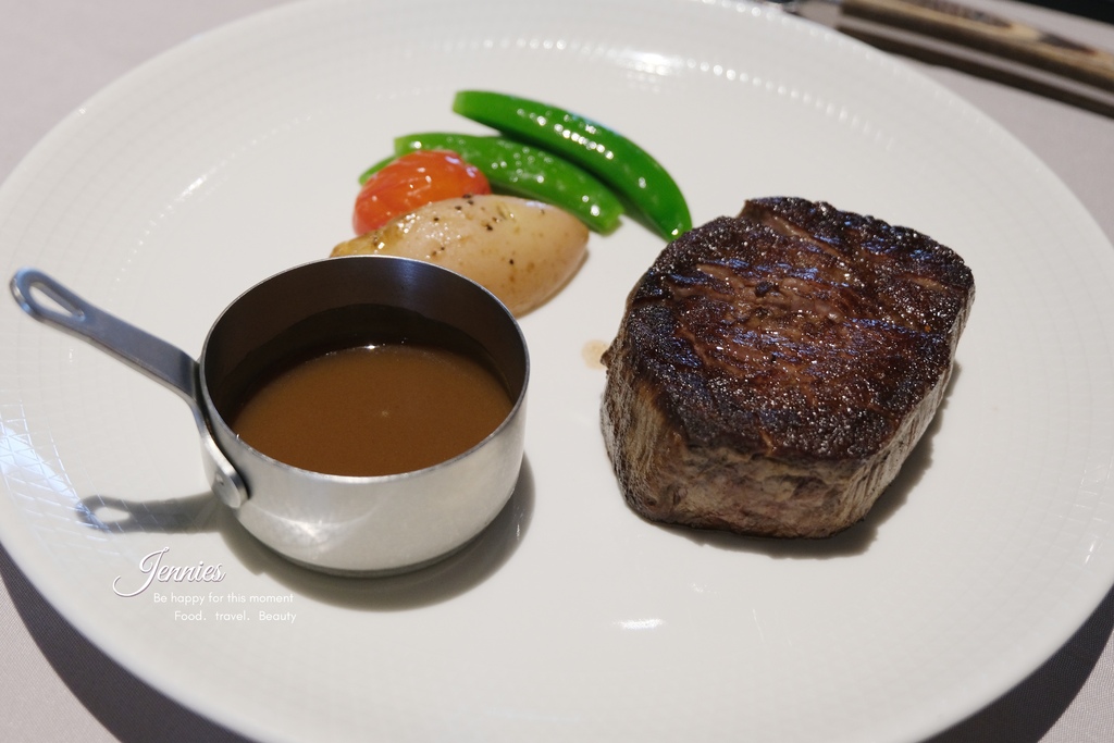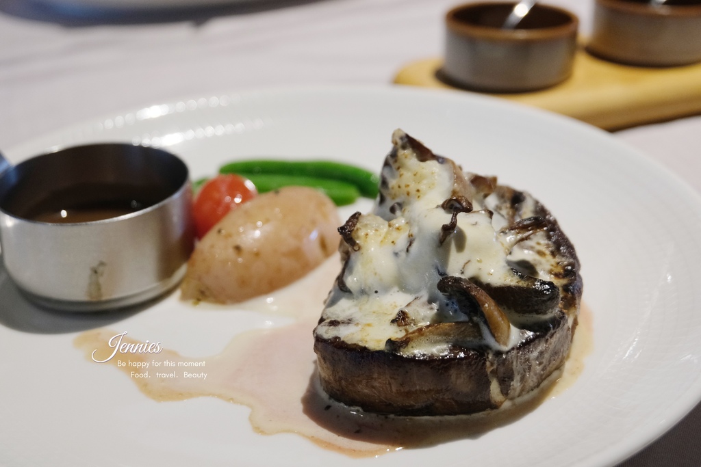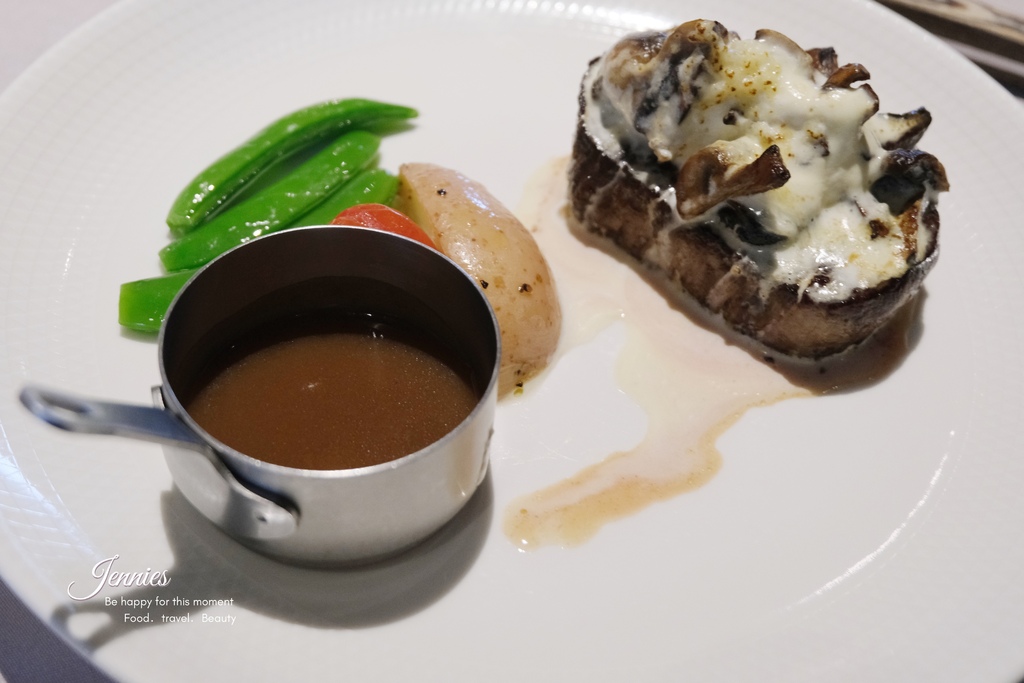 美國PRIME奶油蘑菇菲力牛排是我今天點的,搭配紅酒醬汁沾上一點芥末;吃起來肉質彈性,牛肉的香氣瀰漫。