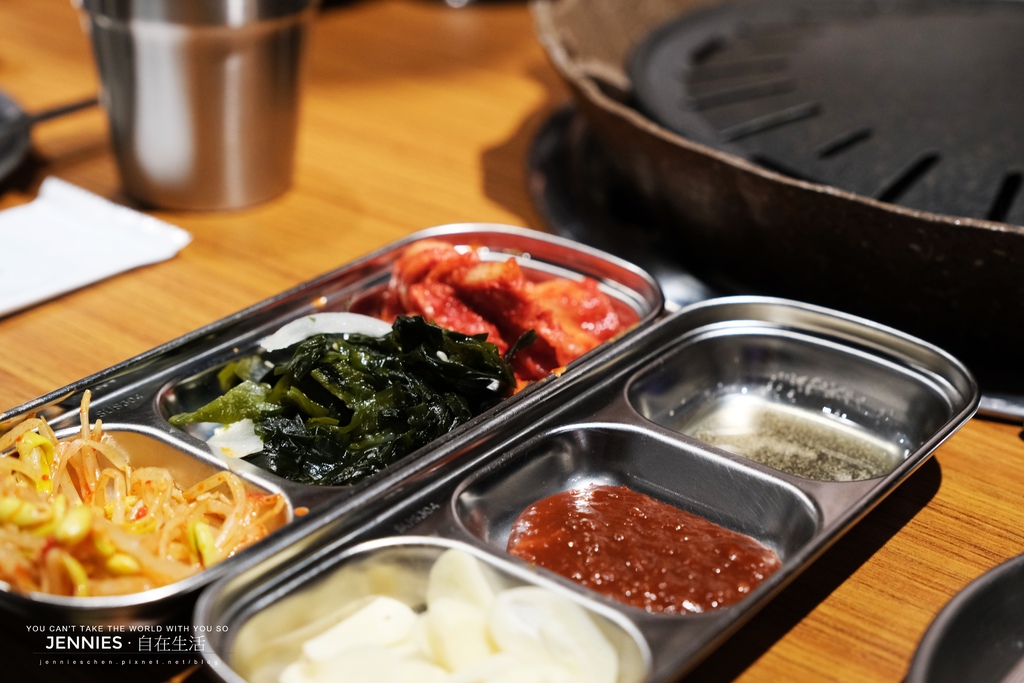 入就座後桌上已經提供三種小菜,泡菜、海帶、豆芽,每種小菜都可以無限續加!!看起來都超級好吃,旁邊也提供了不同的醬料,可以根據個人口味添加。