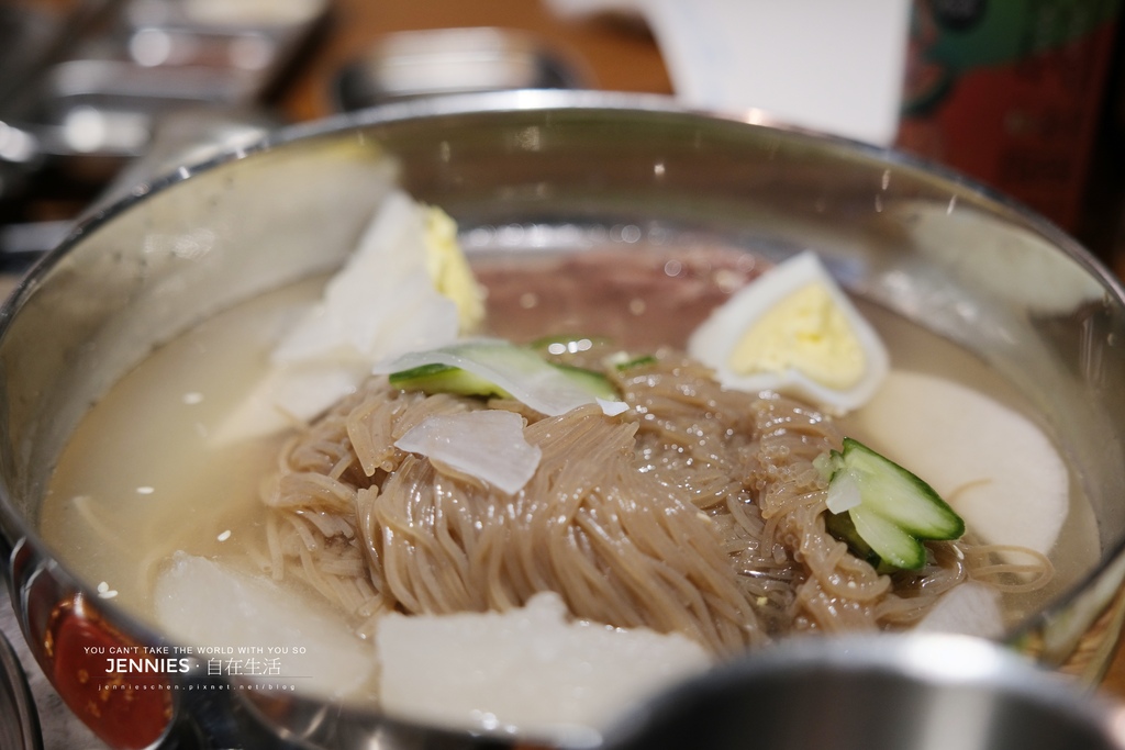 這一碗韓式冷麵有讓我驚喜到!它吃起來的口感好Q滑,帶有一點點酸味非常開胃!冷麵也是韓國餐桌上最具特色的代表,其中以平壤水冷麵最為經典。來自北韓的這道傳統料理以清澈微酸的湯底搭配蕎麥麵條及醃蘿蔔、煮蛋一起入碗。入口瞬間清爽直達心底,是炎炎夏日最解暑的料理之一。
