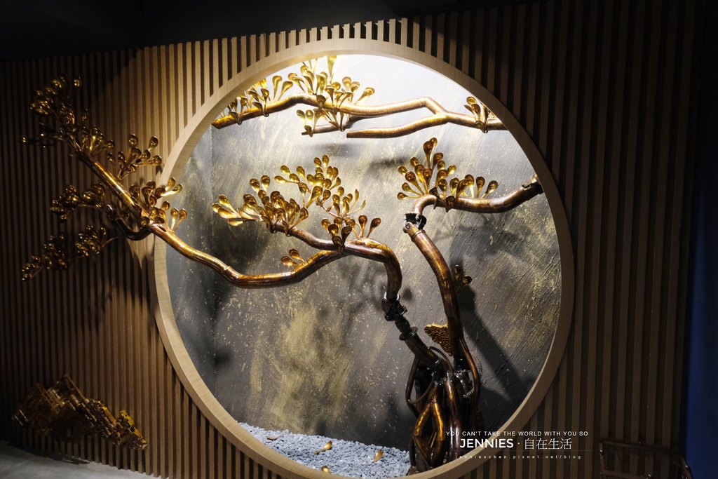 推開門第一眼就被這一件跨界創作所吸引,利用銅製湯匙、鍊條與排氣管組構而成的裝置藝術「迎客松」不僅是迎賓之禮,更像是空間與客人之間的第一場對話。餐廳以京都「金閣寺」靈感作為出發,設計團隊以藍灰金為主調,搭配木質與石材營造出一種沉穩卻富有層次的禪意,展現東方美學中對生命的領悟。