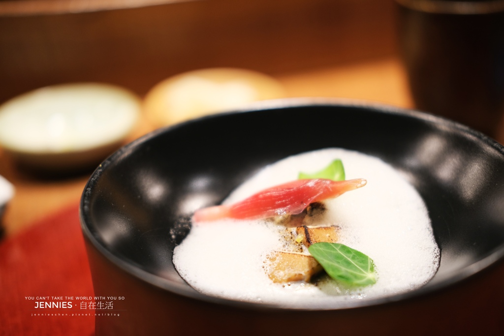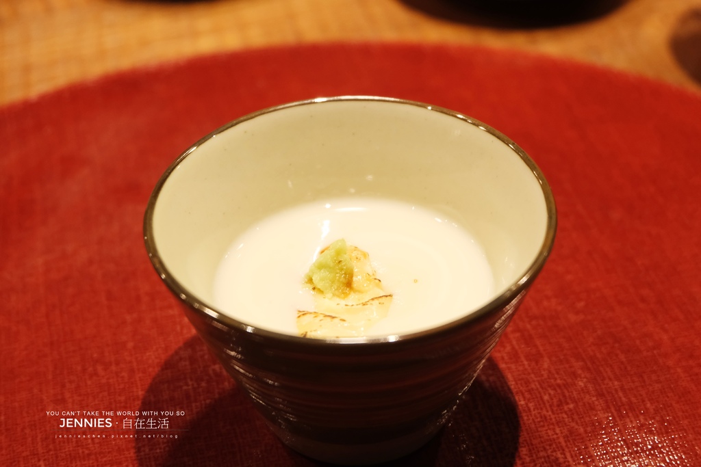 溫柔入喉的豆乳湯,湯底以豆漿為基礎融入柴魚高湯的鹹香,豆香與魚香交融卻不厚重,湯中輕浮著一片京都豆皮湯葉,豆皮微微炙燒了一下使其味道更加濃郁,上頭點綴靜岡芥末與醬油,細膩延伸出旨味的高低起伏。請小心燙口,豆香在口中緩緩綻放,像是京都早晨的霧氣,清雅而優美。