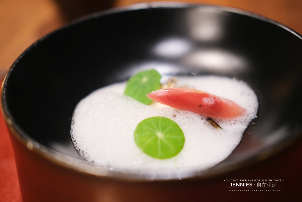 紅色的食材則是來自日本的茗荷(みょうが)使用紫蘇鹽及醋去醃漬,吃起來酸中帶甜,建議吃鮑魚時搭配金蓮葉與泡沫一起食用,香氣與酸味在舌尖交錯,引導味蕾往新的旅程邁進。