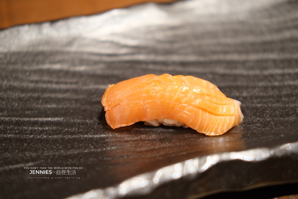 接下來就是壽司的部分,我很喜歡這家的料理設計!不會有太多的生食,前後的菜單設計也非常有條理,這一道握壽司光是在板前看著師傅捏製就好享受喔~選用來自神奈川的櫻鱒,正值肥美高峰期,魚肉粉嫩緊實脂香馥郁,入口細膩清甜。米飯則是來自北海道的七星米及夢美人,顆粒飽滿,晶瑩透亮富有彈性,醋飯調和恰到好處。