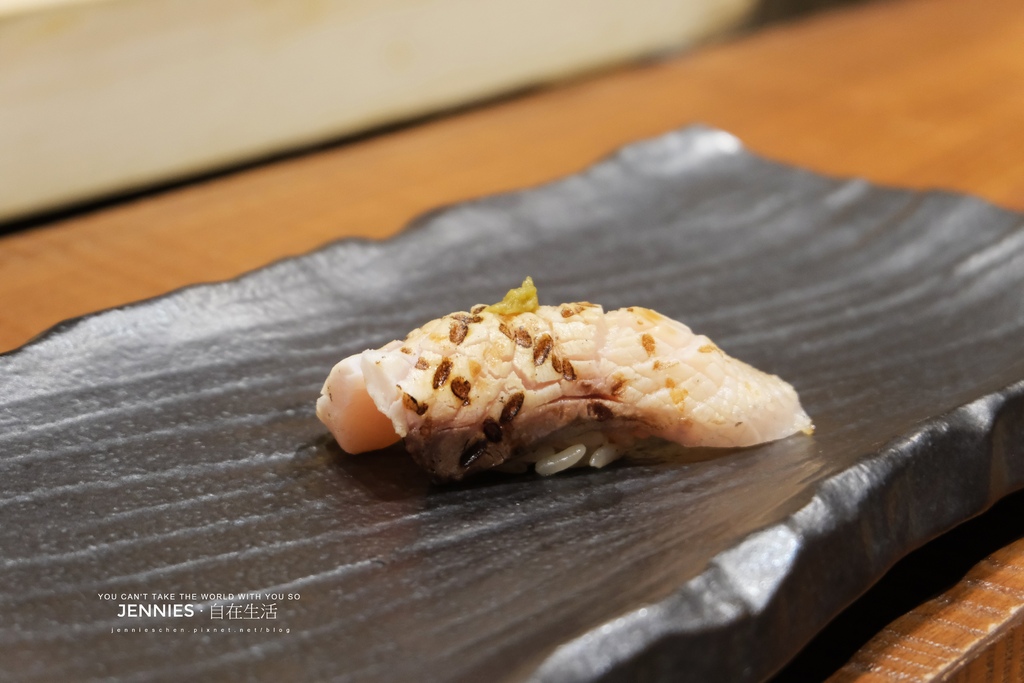 來自和歌山的鮪魚大腹油脂分布如大理石般細緻,在壽司界堪稱極品,師傅先是用備長炭輕輕在魚肉上面炙燒,帶出一股淡淡焦香,將魚腹油脂微微逼出;