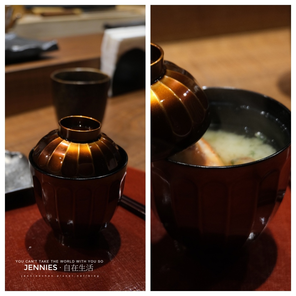 當所有料理的餘香尚未散盡,這一碗味噌湯靜靜端上桌,成為這場餐敘的最後低語。湯中藏著日本牡丹蝦頭,熬煮出湯底鮮濃,蝦的甘甜與味噌的鹹香交融,溫潤不膩。從嘴裡暖到心裡。湯中還加入了來自日本的滑菇(なめこ)口感特別帶點脆,成為這道湯品的亮點之一讓人意猶未盡。