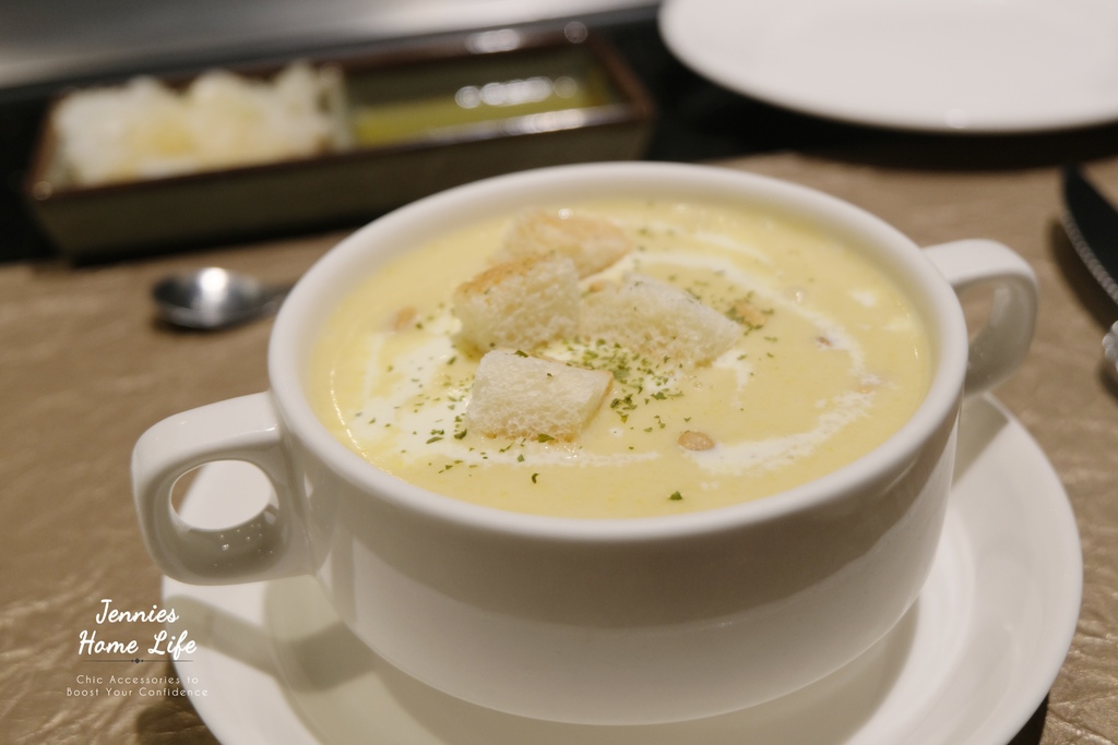 金磚玉米湯是套餐裡的,師傅說一般西餐都是用玉米醬去打完後再用牛奶下去熬煮,我第一口喝下去有種非常熟悉的感覺,是玉米醬的關係吧!餐廳另外還使用了不同品種的玉米下去熬煮,跟外面的玉米濃湯喝起來很不一樣,除了在嘴巴裡可以感受到玉米的纖維以外,它的親和力也是相當高的,喝起來口口濃郁清香。