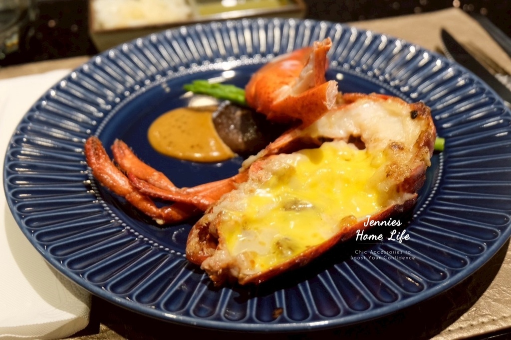 輕輕一剝就可以吃到波士頓龍蝦彈牙的肉質,加上香濃的起司,整道吃起來很過癮!配菜是蘆筍及香菇。
