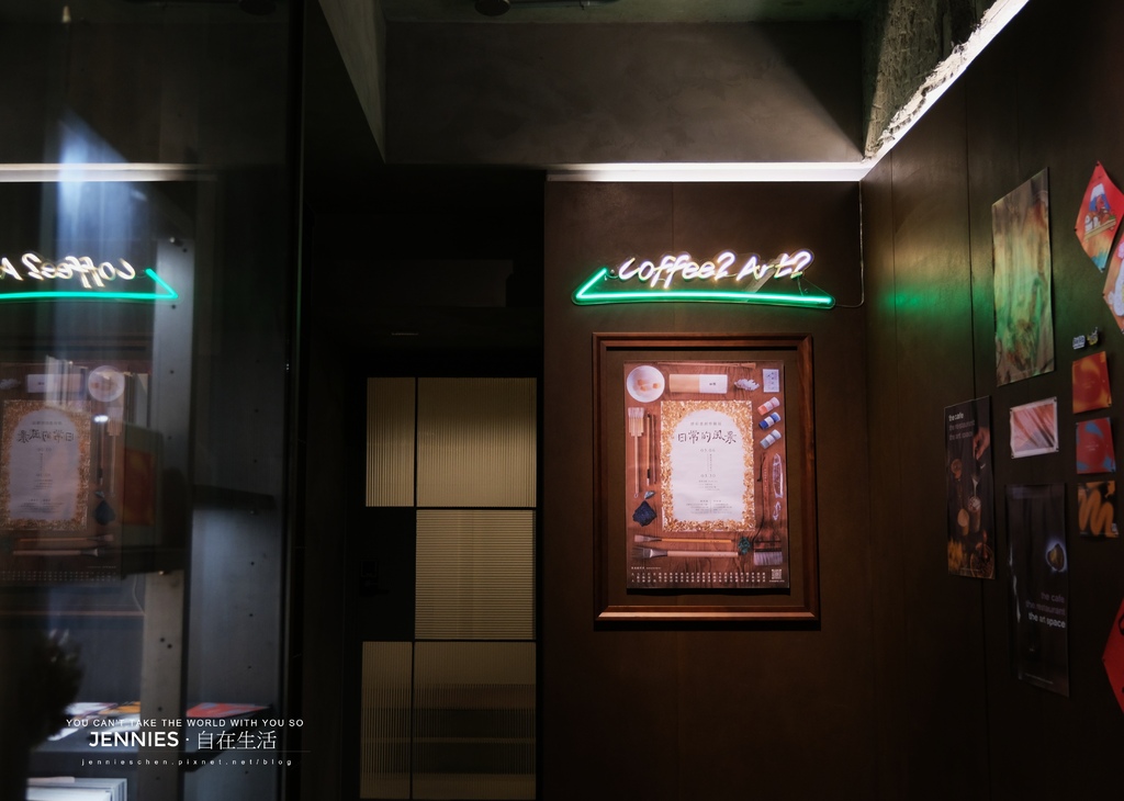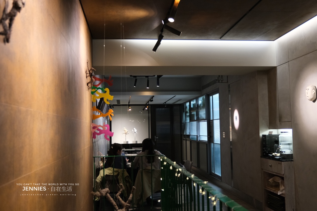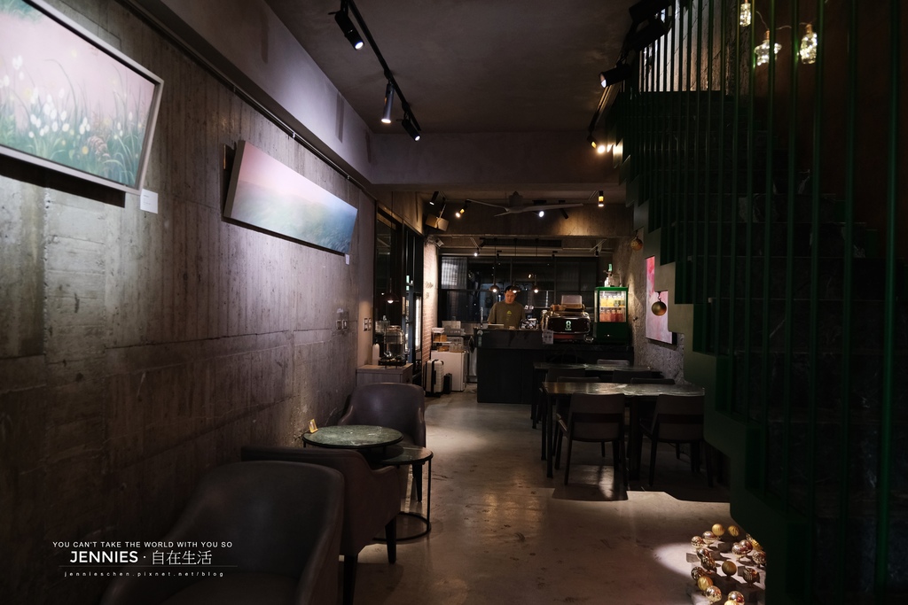 餐廳分為一、二樓;一樓後方為藝術佈展,每隔一段時間就會跟不同的藝術家合作,前方為櫃台及點心冷藏櫃,整間餐廳的光源偏暗,加上工業風的設計相當有個性。
