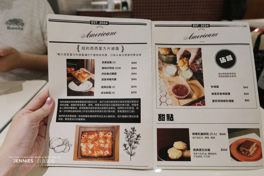 也把午餐時段可以點的披薩菜單貼上來,甜點有檸檬乳酪餅乾及經典提拉米蘇;另外菜單上寫的沾醬是可以搭配香烤蒜結一起食用(香烤蒜結也是使用披薩剩下的材料做成不同的外型及口感),加入帕達諾乾酪及帕西里,感覺很適合下午茶當點心。