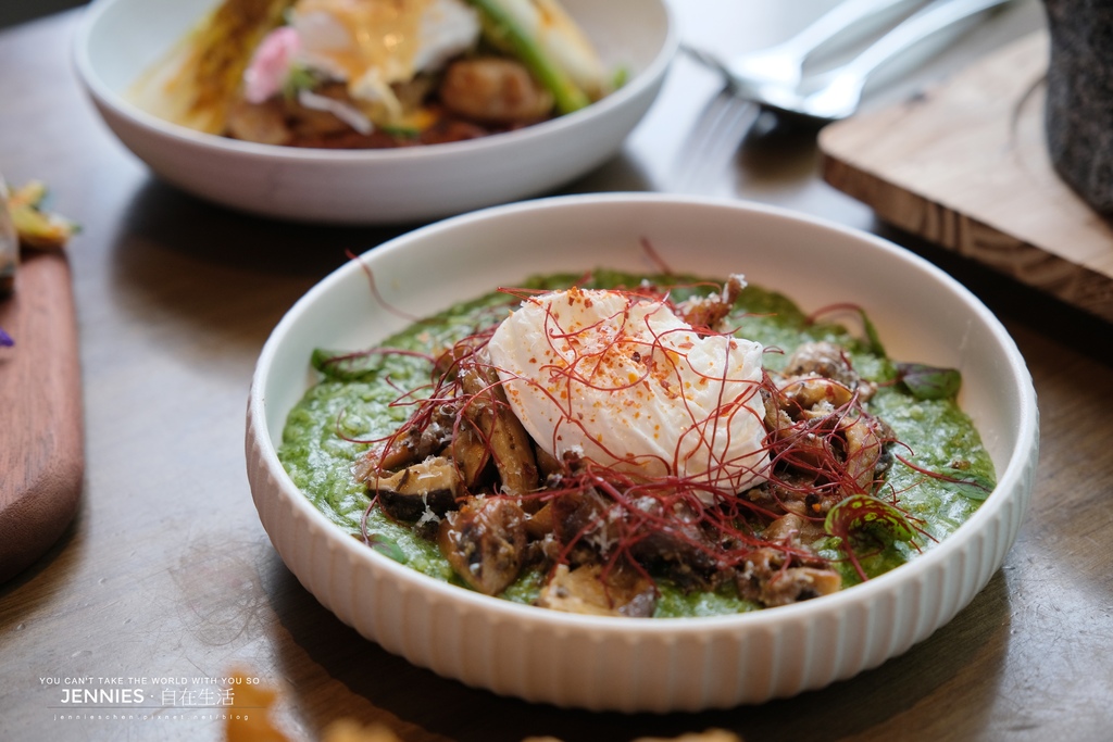 野菇炒香後呈現出多層次的木質氣息,中間點綴的水波蛋劃開那一刻,蛋黃如金色熔岩流下和菠菜燉飯松露香氣融合瞬間美味升級。上方灑上紅椒粉與紅辣椒絲,微辣帶香,讓整道菜有了味覺與視覺的活潑調性。