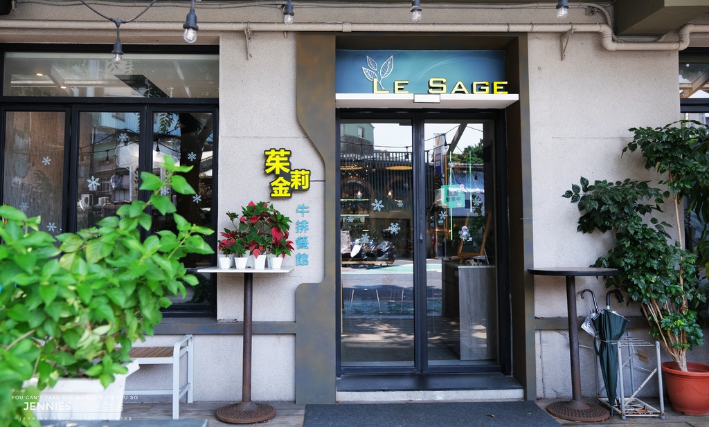 走近茱莉金牛排餐館像是走入一座小小庭院,欄杆圍牆上種了許多綠草花葉。2019年對外營業累積不少熟客。招牌以黃黑配色的「茱莉金」傳遞出品牌自信的視覺語言,門前的聖誕紅盆栽為冷調灰牆增添生活氣息,也讓這間主打美式牛排餐廳更加平易近人。