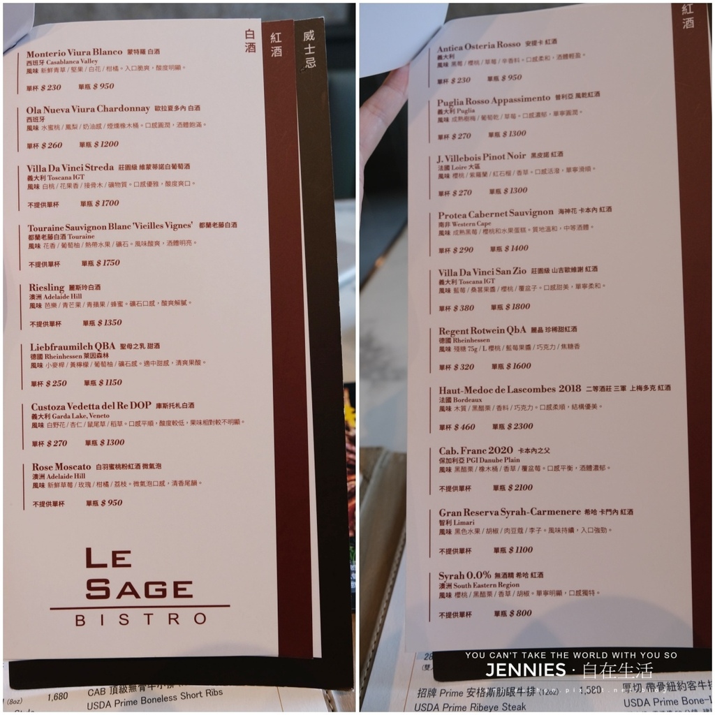 酒單看起來也滿厲害的。提供紅、白酒及威士忌,酒類都有詳述酒體的口感及風味,感覺比一般的牛排餐廳更為專業。酒單設計以單杯品飲為亮點,涵蓋多款紅、白酒款,讓餐與酒的搭配更具彈性與探索趣味。