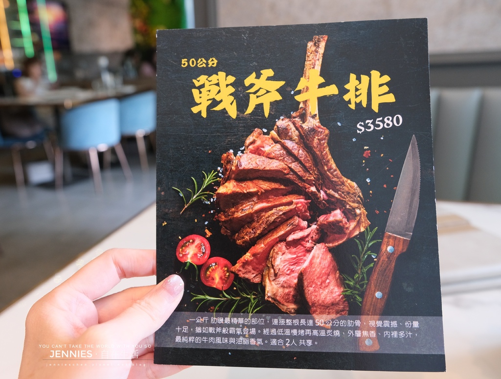 主打美國USDA Prime等級鮮切牛排,不只有外酥內嫩的12oz厚切肋眼,也有浮誇長達50公分的戰斧肋眼,足足1公斤兩人分享剛剛好,重點是拍照超!有!氣!勢!