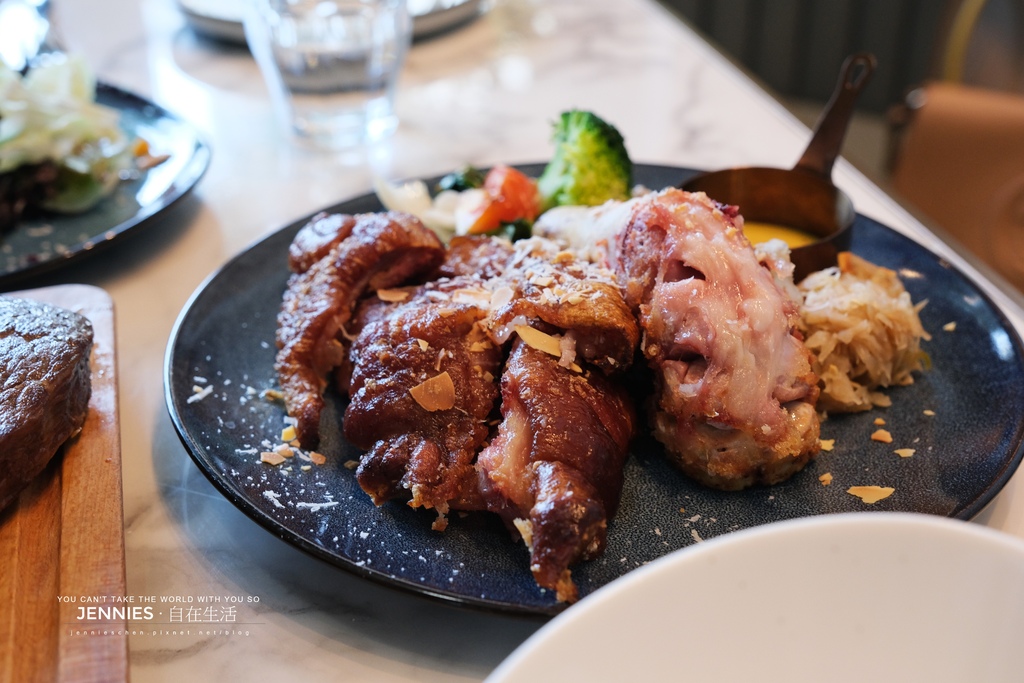 這道外型如同戰斧般氣勢磅礡,搭配薯泥及花椰菜還有蕃茄。