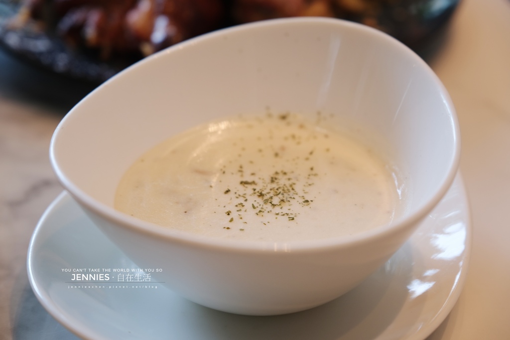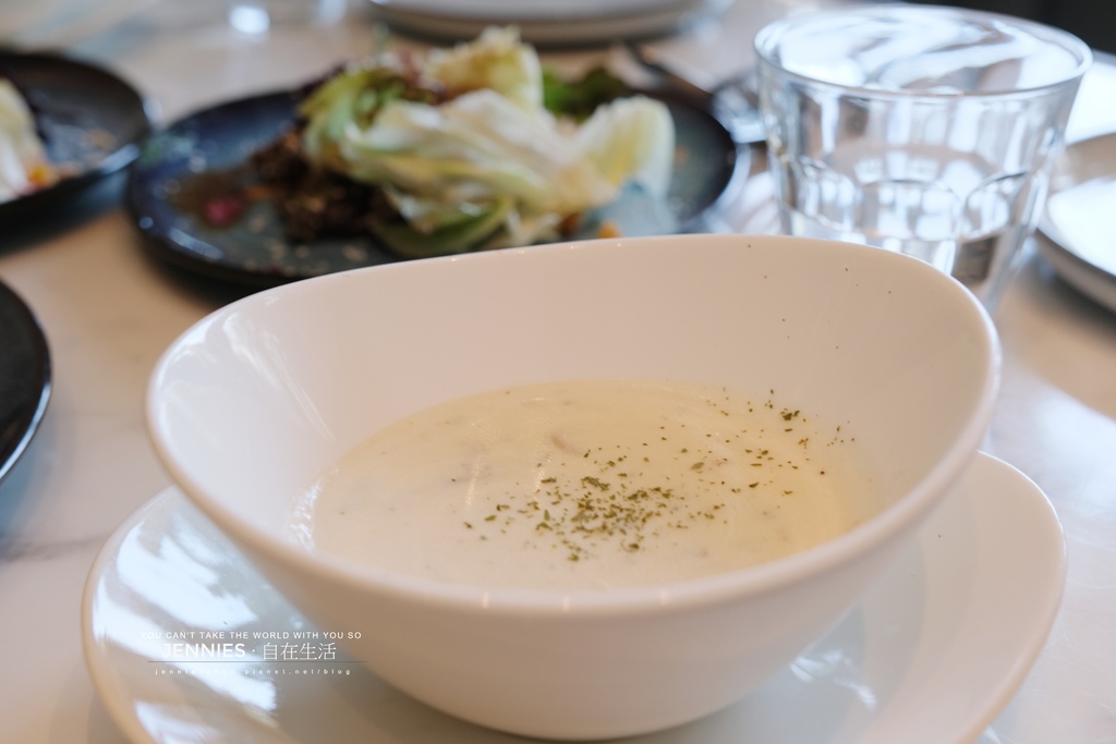 今日湯品為蛤蠣馬鈴薯濃湯,以新鮮蛤蠣熬煮出的海洋鮮甜,融合綿密馬鈴薯的溫潤口感,交織出一碗屬於初夏的柔和節奏。