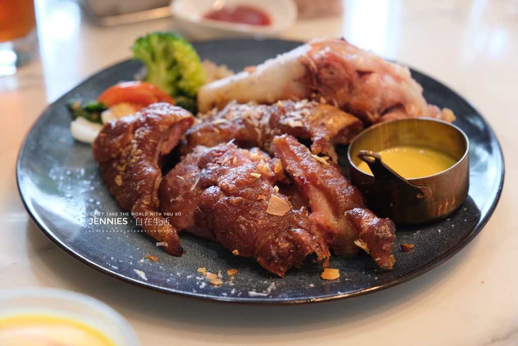 選用厚實豬腳以慢火將油脂逼出,咬下瞬間「喀滋」作響;吃起來膠質滿滿柔嫩Q彈,脂香在舌尖緩緩化開。