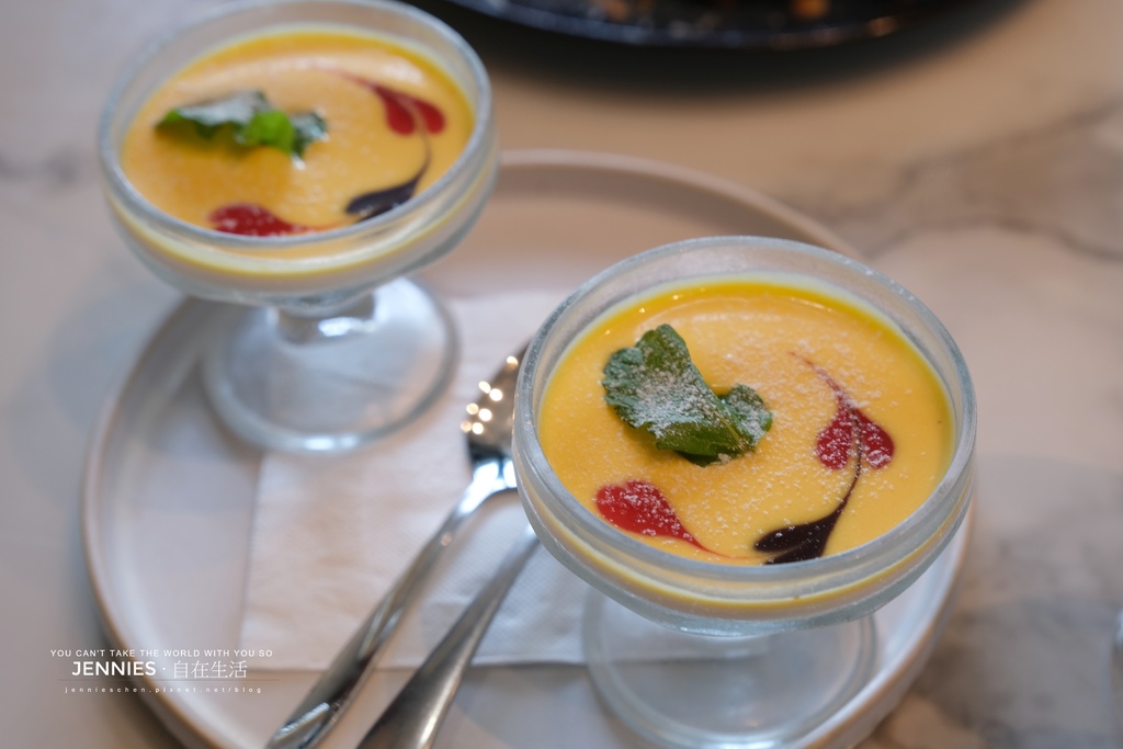 以法國進口全動物性鮮奶油與台灣小農當日鮮乳,依1:1黃金比例慢火煨製,低溫凝固後呈現如絲絨般滑順的奶酪質地,入口即化,溫柔得像在說悄悄話。頂層覆蓋著以新鮮芒果小火細熬45分鐘的濃郁果醬酸甜平衡,果香層層綻放,是盛夏午後及餐後時光的小小開心。