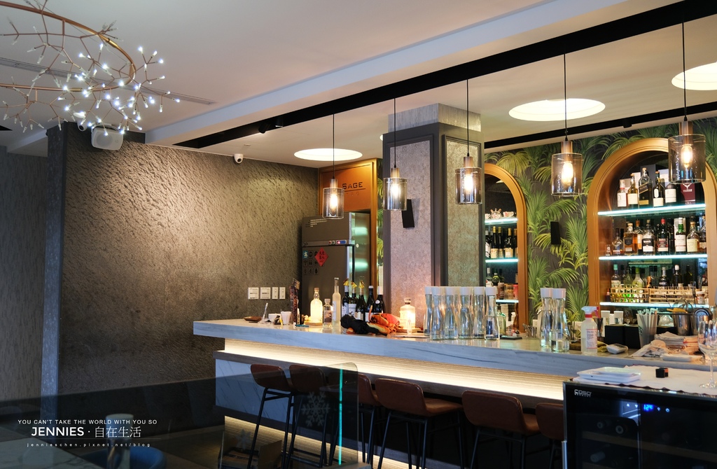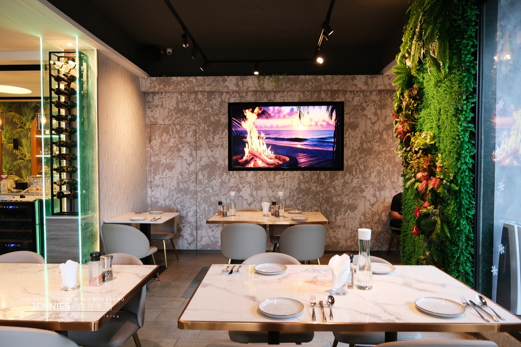 吧台背後以拱形酒櫃與熱帶植物花紋壁紙作為設計,渡假氛圍滿滿的!也有著熱帶風情的熱情與生命力。