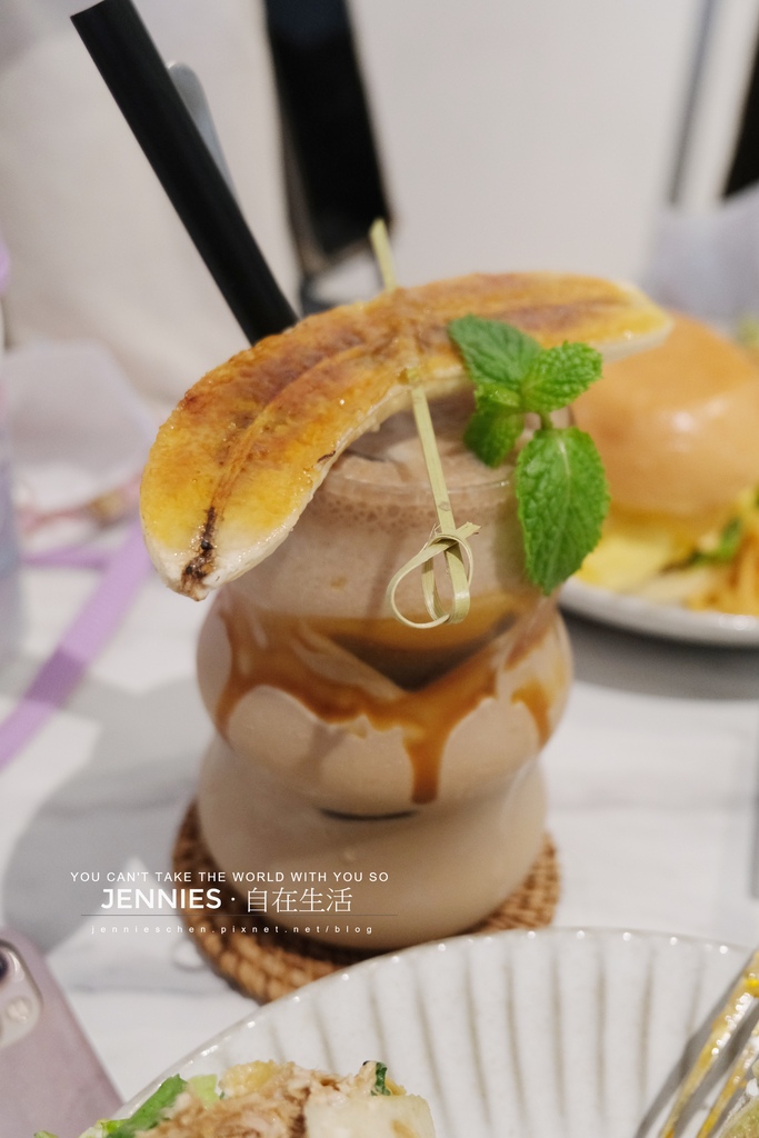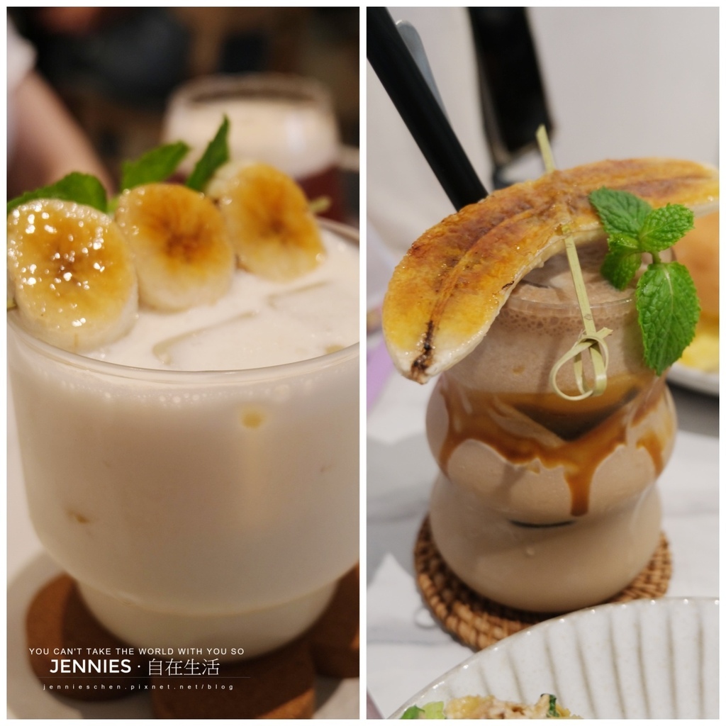 這兩杯飲品一上桌就讓人忍不住多看好幾眼,香蕉牛奶上頭是用切成圓形的香蕉片點綴,而我的香蕉拿鐵則是插著炙燒過的香蕉片,表面微微焦糖化甜香四溢;冰涼濃郁的香蕉牛奶,入口滑順口感綿密,喝起來就像是喝進了下午的溫柔陽光。