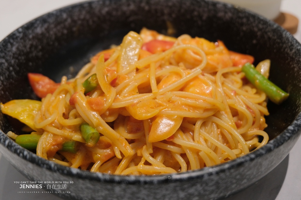 色彩飽滿醬汁濃郁的義大利麵光是看照片就讓人食指大動!濃郁中帶著一些酸甜,恰好中和了奶油的厚重感,搭配蝦仁、四季豆與甜椒口感層次豐富。麵條煮得剛剛好不會過軟,保留微微彈性,每一口都能吃到醬汁緊緊依附的美味。