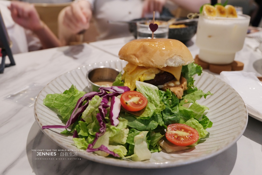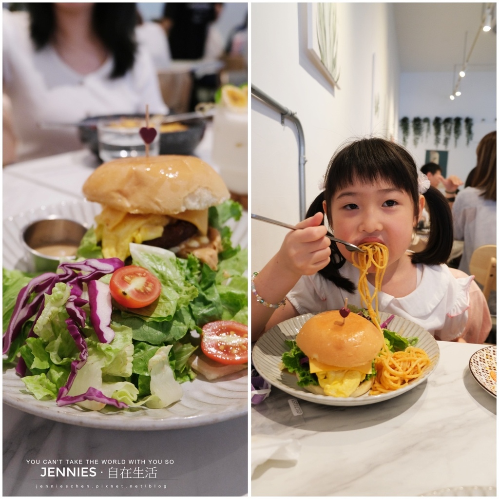 漢堡裡的牛肉排厚實多汁帶點焦香,咬下去瞬間就有肉汁在嘴裡散開。搭配一旁的清爽沙拉與胡麻醬,味蕾剛好被拉回平衡狀態,小朋友餐盤裡的麵條是粉紅醬鮮蝦義大利麵。這一餐我們分享著吃,每一道都是不錯又實在的早午餐料理。