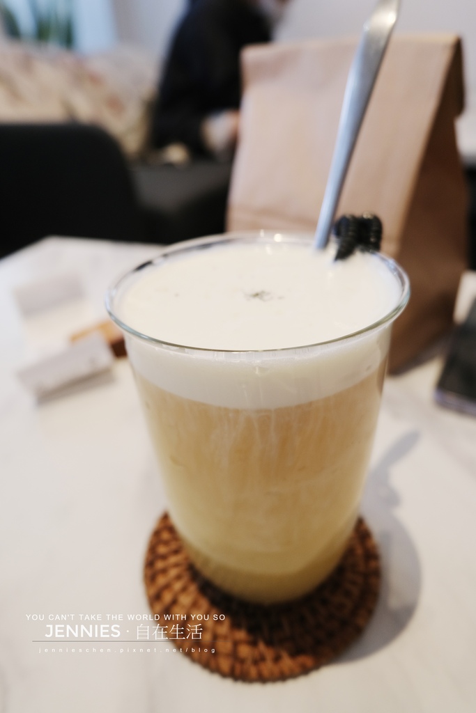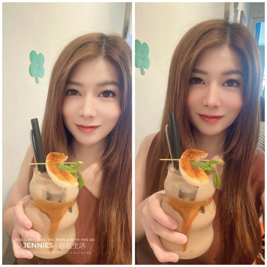 我好喜歡我的香蕉拿鐵,不僅裝盛的杯子造型可愛!還藏著小驚喜,喝著拿鐵的時候底層可以喝到堅果顆粒感,在咖啡與香蕉融合的香氣中增添了層次與口感,果仁香特別迷人。