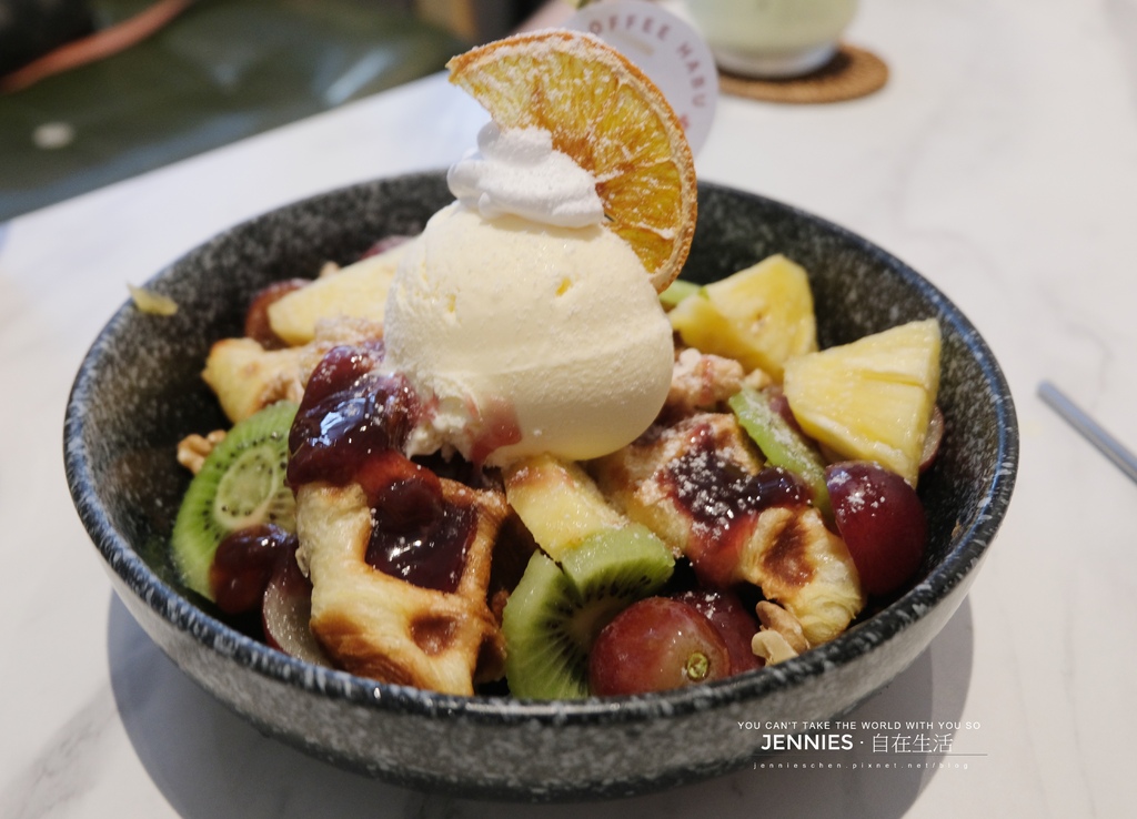 喜歡鬆餅的作法!是我喜歡的可頌鬆餅,吃起來帶著可頌的奶油香氣及層次感,加上一球香草冰淇淋,冰火交融每一口都幸福到不行!水果也給的滿滿的,葡萄、鳳梨、奇異果...真的是一家料好又實在的咖啡店。