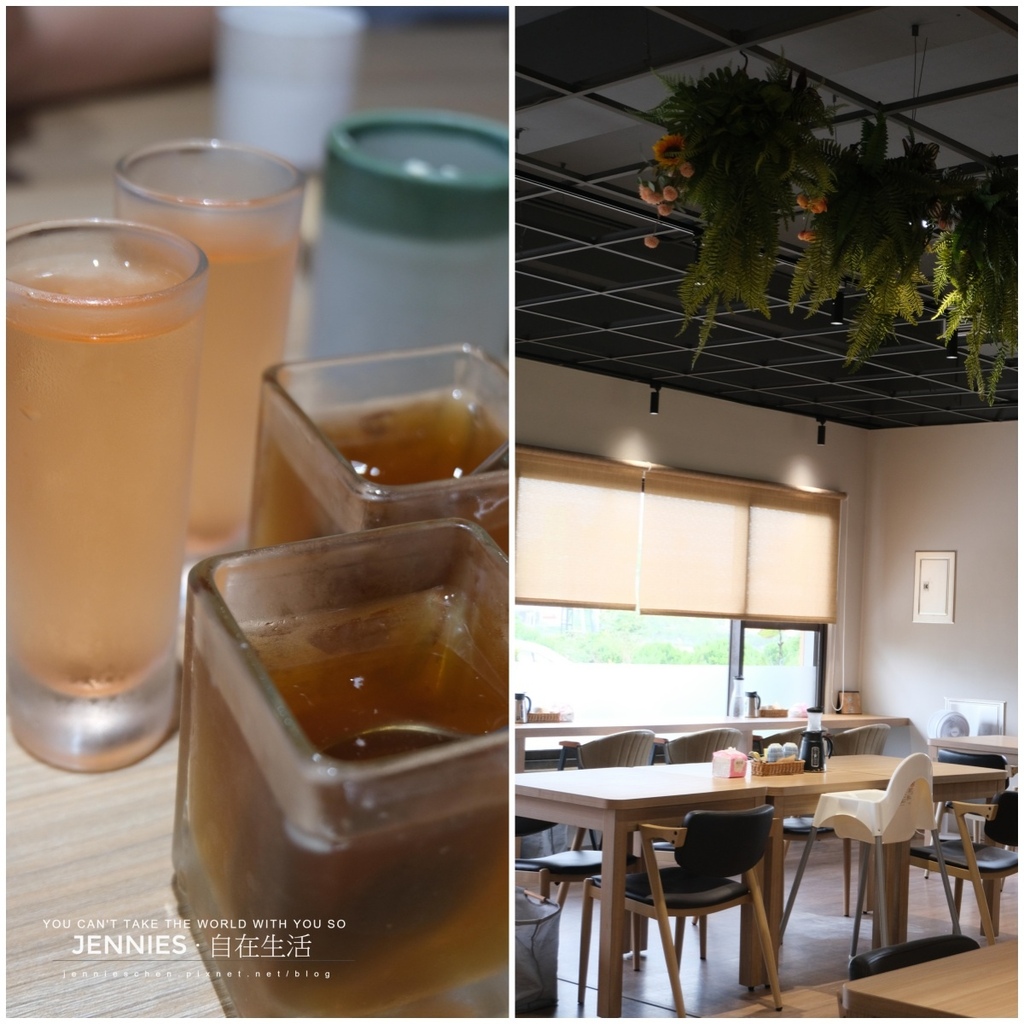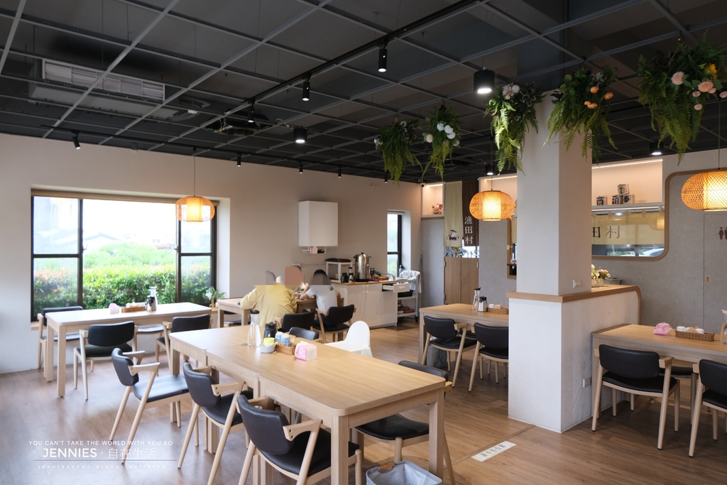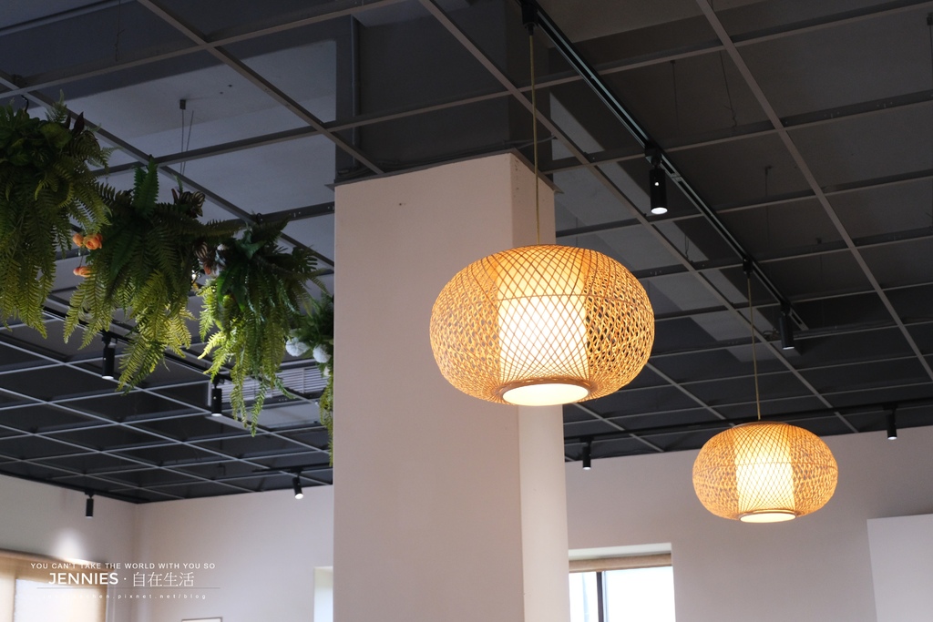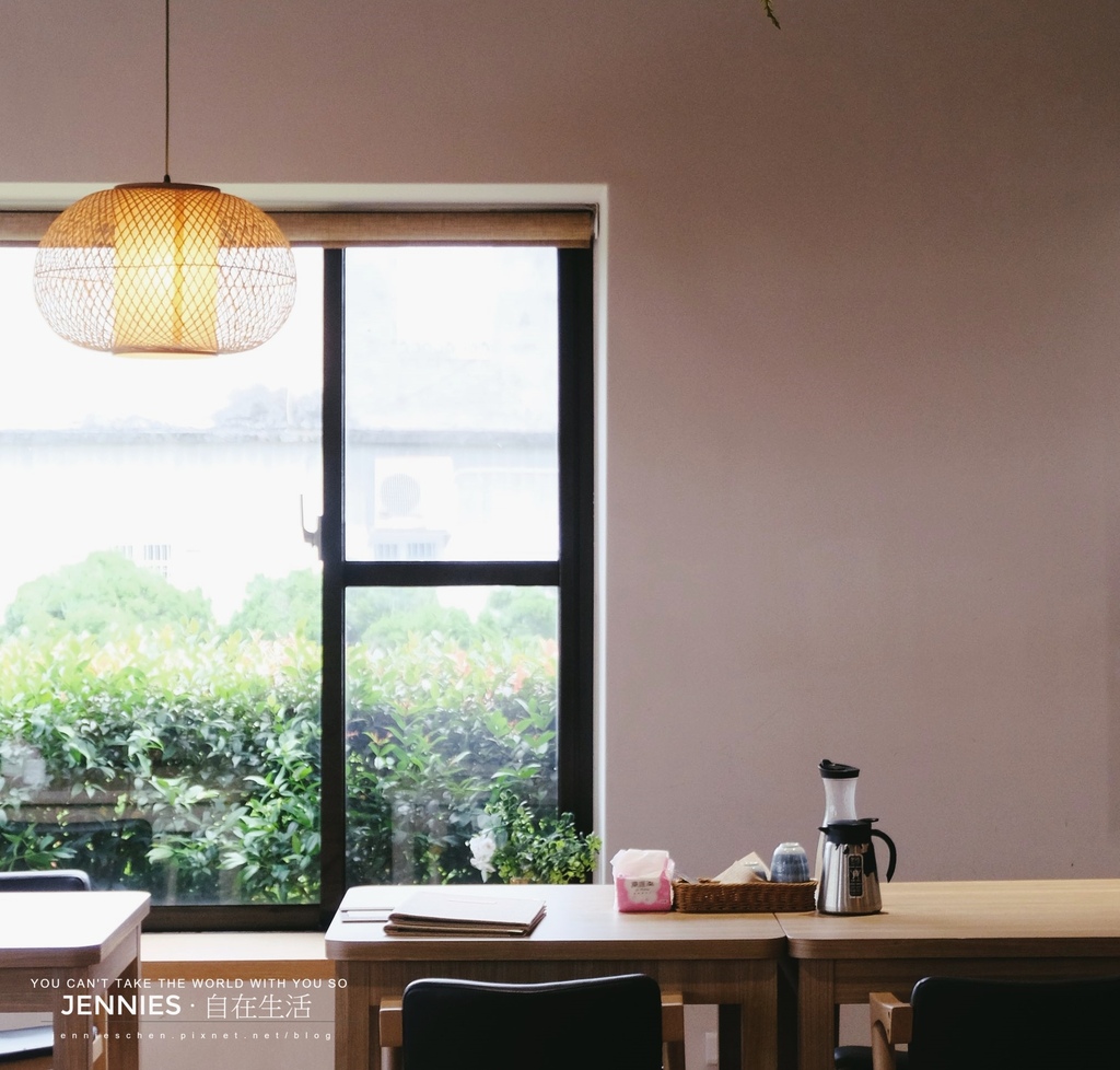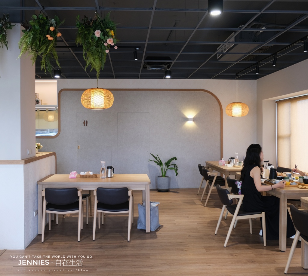 內用空間寬敞舒適,木質桌椅、暖黃吊燈與天花板垂墜的綠意植栽共築出一方靜謐天地。陽光從大片窗戶灑入,映照出淡雅的日系氛圍。無論是與好友聚餐還是一個人靜享午餐時光,都能在這裡感受到被一種被接住的溫柔。