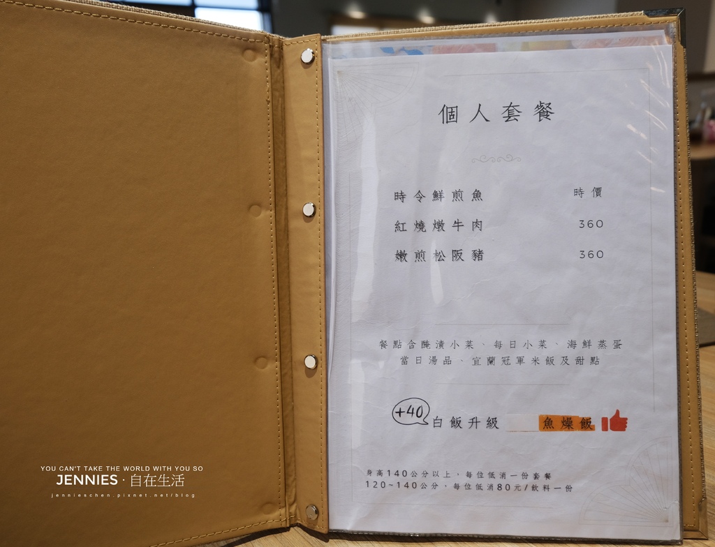點餐方式為QRCode掃碼點餐,菜單主要分有個人套餐以時令鮮煎魚、紅燒燉牛肉、嫩煎松阪豬為主,餐點皆附醃漬小菜、每日小菜及宜蘭冠軍米飯、甜點為主。內用低消每人一份套餐、若身高在120~140公分之間,每人低消80元/飲料一份。除此也提供漁田海味鍋、湯飯、透抽米粉、鮮切海魚片、豪華海鮮鍋及冷熱飲。