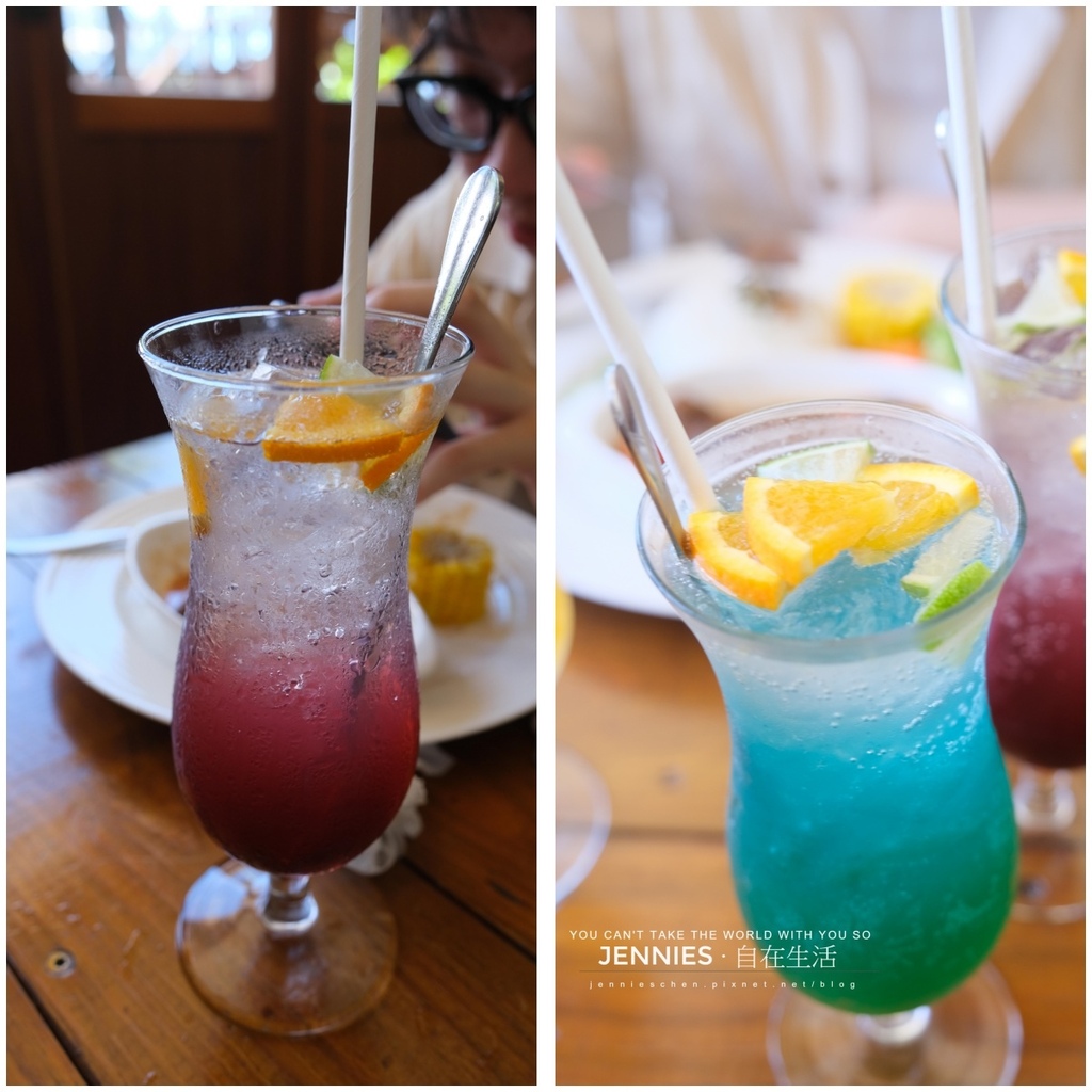 點了氣泡飲與百香藍柑橘特調,色彩鮮明有著夏日的繽紛感。白色布幔隨風飄搖光影從葉間灑落,桌上的藍柑橘氣泡飲泛著光,這樣的畫面好像是一封寫給生活的情書。