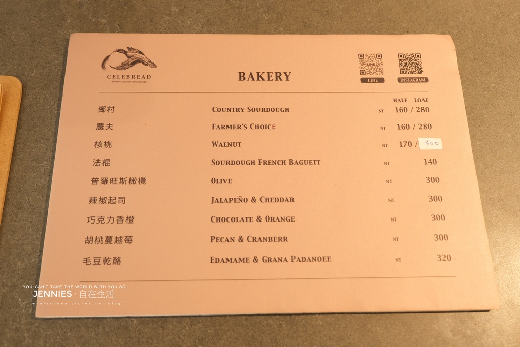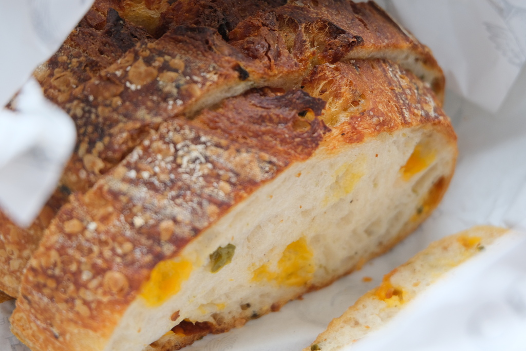 店內有賣咖啡及酸種麵包,品項我也拍上來給大家參考。其實平常我不大吃麵包,麵包的壞處時有所聞,但偶爾為之也不過份。酸種麵包向來是愛恨分明的角色。有些人嫌它太硬太「考牙齒」,但對我來說懂了就回不去了。尤其搭配手工果醬酸甜交錯口感層層疊疊,就像一首迷人的爵士樂。這天選了店內超人氣的胡桃蔓越莓及辣椒起司,二種麵包就花了我600元。