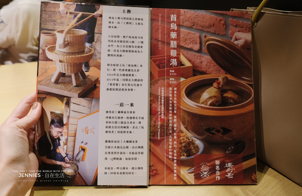 在稻舍米飯不是配角而是主角。迪化街老店選用台中霧峰的益全香米帶有天然芋香;而百貨公司則引進改良自日本品種由台灣農民契作培育的大橋越光米。從農夫的雙手到餐桌,一條看似平凡的白米之路,也就此化為一段動人的家鄉物語。