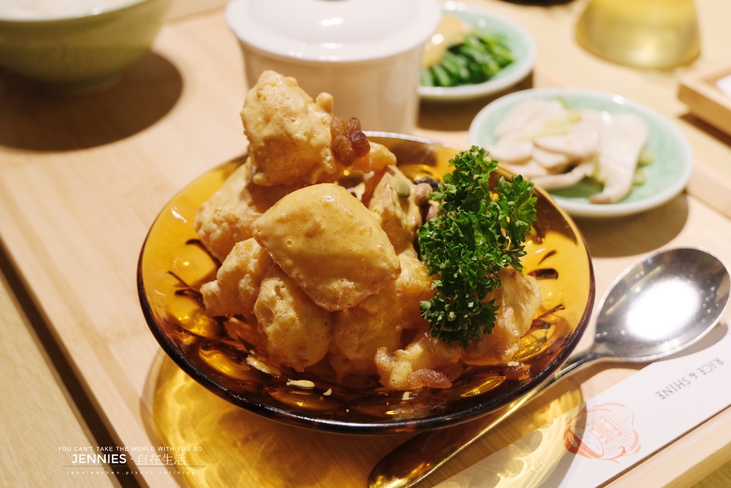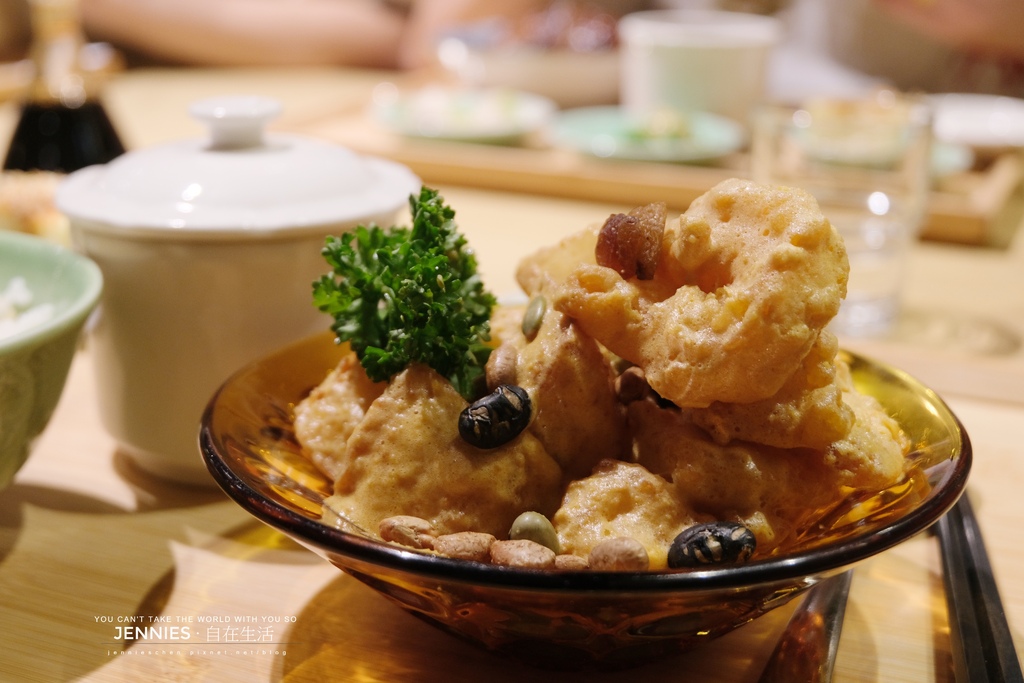 這道金沙蝦球選用肥美大白蝦,外層金黃酥脆,再拌入炒香的鹹蛋黃,一上桌就香氣四溢,視覺與味覺雙重誘惑。金沙的鹹香裹住蝦肉,每一口都酥中帶嫩,濃中帶鮮,讓人一吃就停不下來。特別的是主廚巧妙搭配了爽脆的豆薯與迪化街綜合豆仁,作為解膩的小巧思,讓這道重口味的菜餚多了幾分清爽與脆口層次。不過老實說,雖然吃起來真的好吃,但後段還是略顯厚重,屬於前半段會讓你眼睛一亮,後半段需要一點綠茶或湯品來「救援」的那種豐盛感(笑~)。