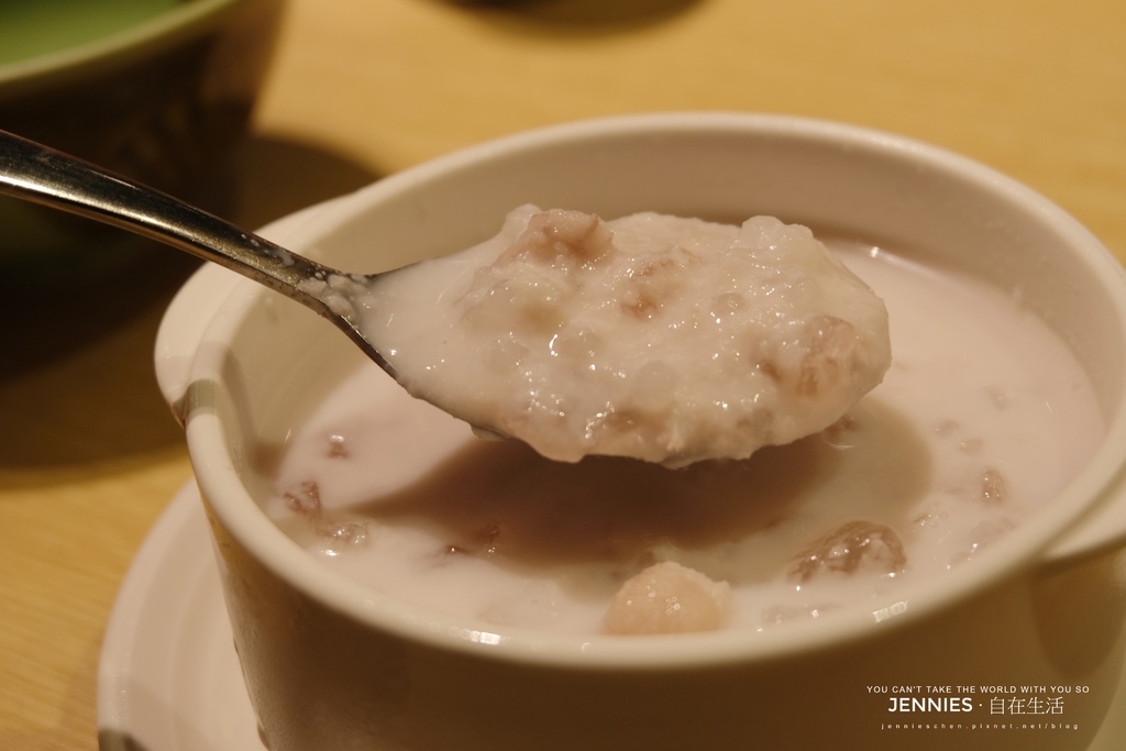 愛芋頭的我怎麼能錯過這道椰香QQ西米露?選用台中大甲芋頭熬煮成泥,綿密香濃入口即化。搭配晶瑩剔透的西米露與Q彈的椰果小顆粒,口感層層分明,椰漿的香氣則在舌尖緩緩展開,太滿足啦~